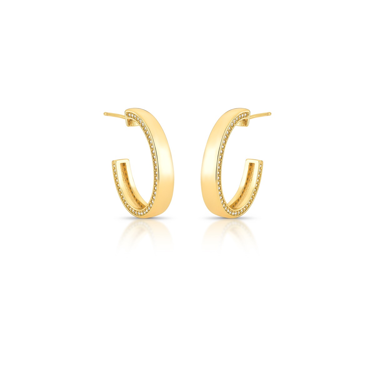Seu formato de meia argola abraça o lóbulo com conforto, enquanto o acabamento polido e as pedras cravejadas criam um equilíbrio perfeito entre minimalismo e sofisticação.