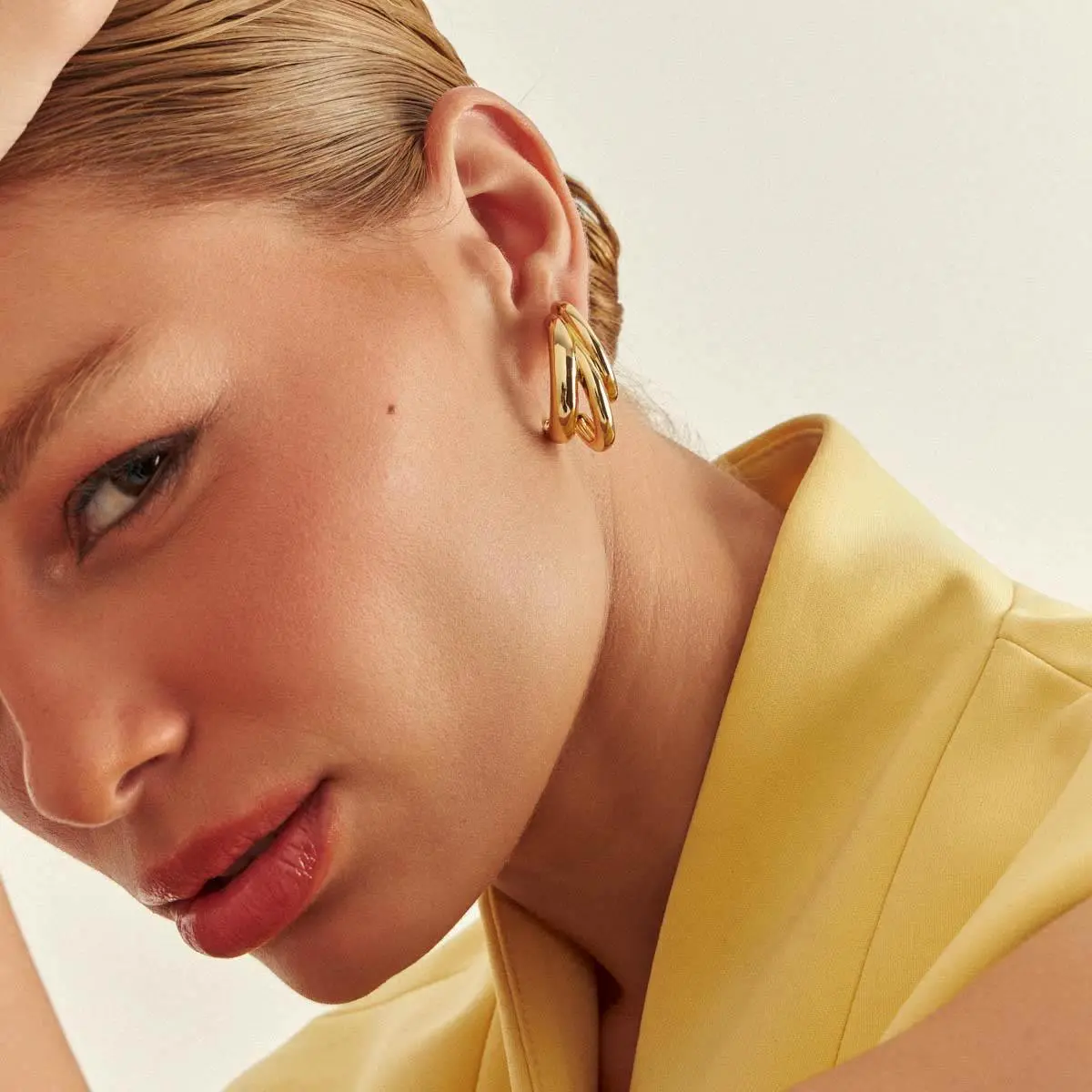 No banho de ouro, a peça ganha brilho suave e acabamento polido, ideal para quem busca um brinco marcante, mas extremamente versátil. O formato de meia argola média valoriza o rosto e funciona perfeitamente tanto para o dia a dia quanto para produções mais elaboradas.