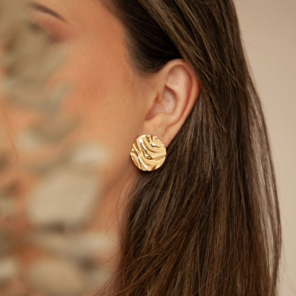 Com design contemporâneo e acabamento artesanal, o brinco botão orgânico martelado em banho de ouro é uma peça que traduz sofisticação com naturalidade. Seu formato orgânico aliado ao efeito martelado cria uma superfície rica em textura, refletindo a luz de forma única e elegante.