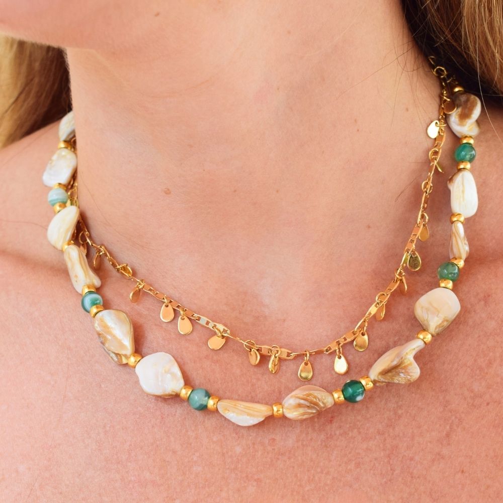 Inspirado pela leveza do mar e pela sofisticação natural das pedras, o ColarJade traduz o equilíbrio perfeito entre frescor e elegância. A madrepérola traz luminosidade suave, enquanto a pedra natural verde jade adiciona um toque de cor sofisticado e atemporal à composição.