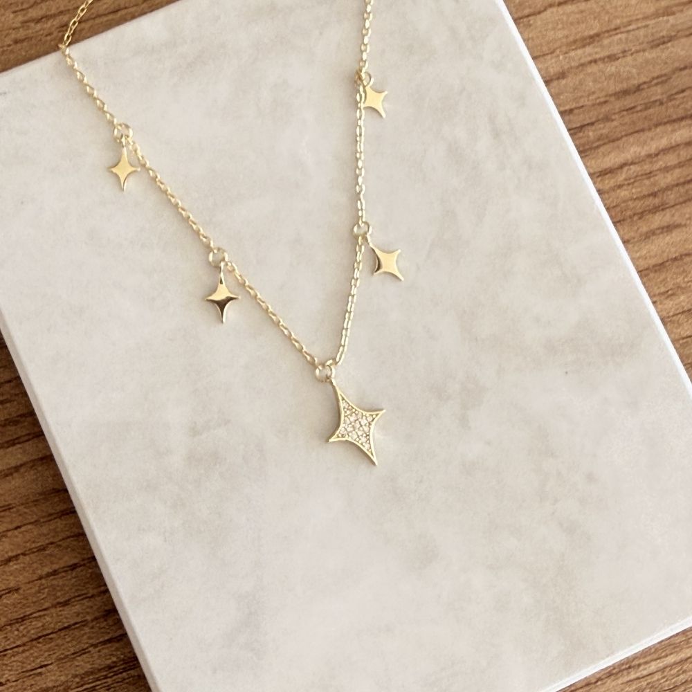 O Colar Stars traz leveza e brilho em um design delicado e encantador. Com pequenos pingentes de estrelas micro cravejadas distribuídos ao longo da corrente, a peça cria o efeito de pontos de luz flutuando no colo, iluminando o visual com sutileza e sofisticação.