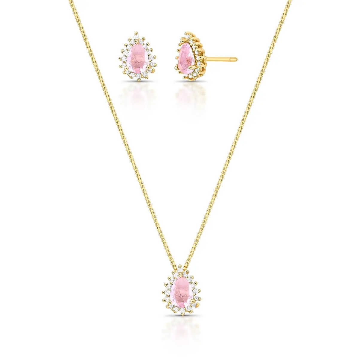 Ao redor da pedra central, uma microcravação de zircônias adiciona luminosidade na medida certa, criando um acabamento refinado e delicado. O banho de ouro 18k garante sofisticação e versatilidade, tornando o conjunto ideal tanto para o uso diário quanto para ocasiões especiais.